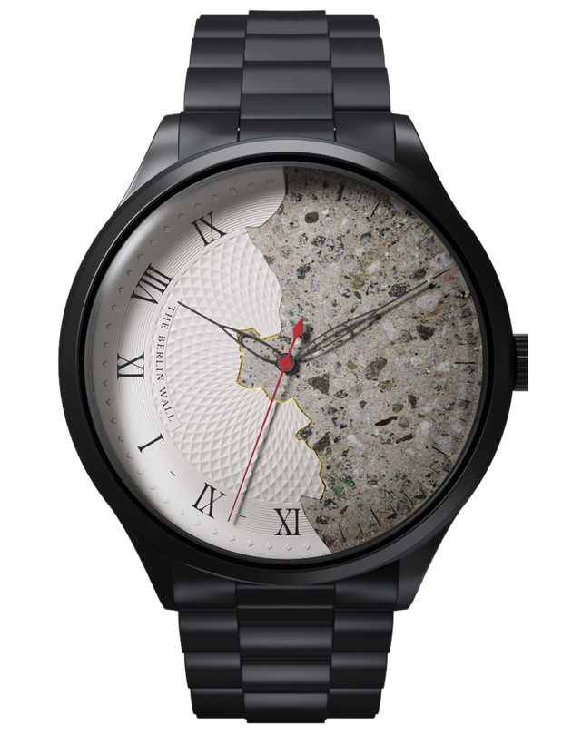 The Berlin 1989 collection incorporates an authentic fragment of the Berlin Wall, acquired from a partner company based in the German capital. Visible on the right side of the dial, each fragment is unique in its shape, material, and history. The collection is limited to 1,989 numbered pieces.