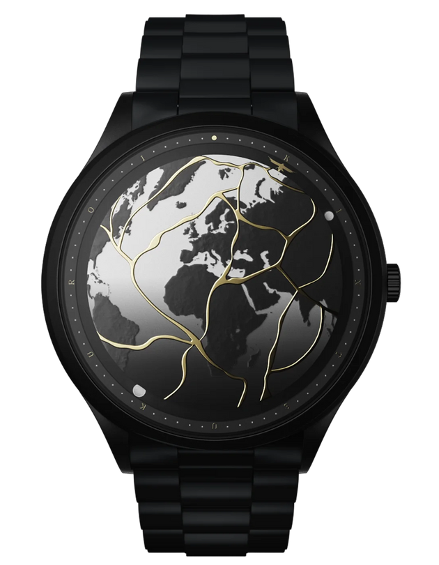 The 2020 Resilience collection is inspired by Kintsugi, a Japanese art of repairing broken objects with gold, revealing the scars instead of hiding them. The watch adopts an inverted structure, where the dial overhangs the hands, as if to sublimate a fractured earth. The collection is limited to 2,020 numbered pieces.