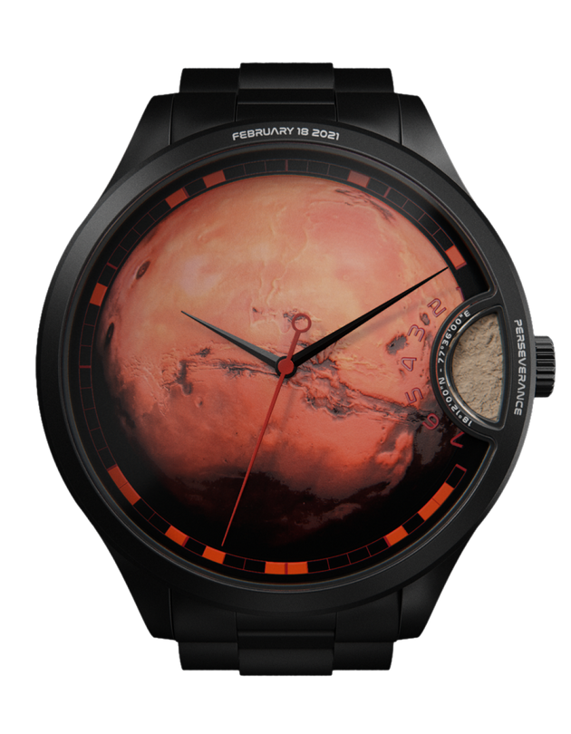 Dit horloge is voorzien van gecertificeerd Mars-meteorietstof. Het stof van Mars is opgesloten in een afgesloten saffierkristallen kamer op 3 uur. Bij elk horloge wordt een echtheidscertificaat voor meteorietstof geleverd.