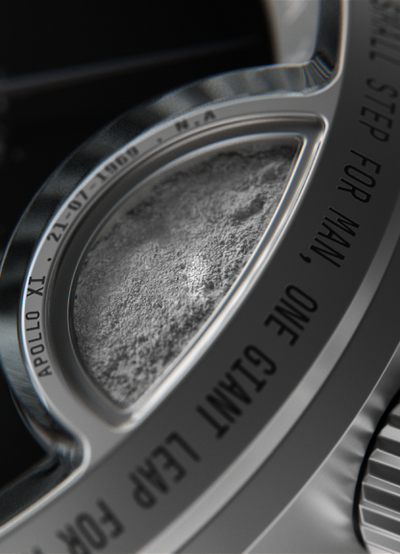 Cette montre comporte de la poussière de météorite lunaire certifiée, méticuleusement incorporée dans la chambre en cristal de saphir à 3 heures. Chaque montre est accompagnée d'un certificat d'authenticité, vérifié par MSG Meteorites.